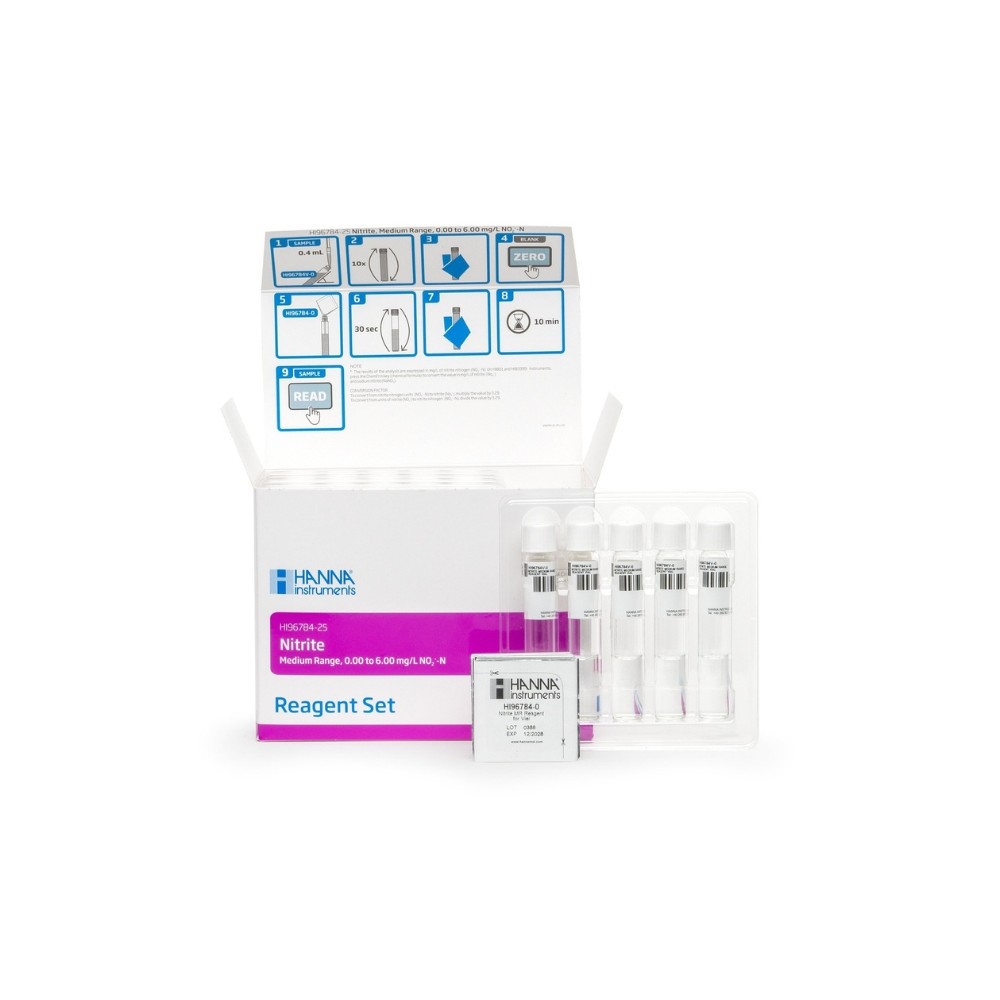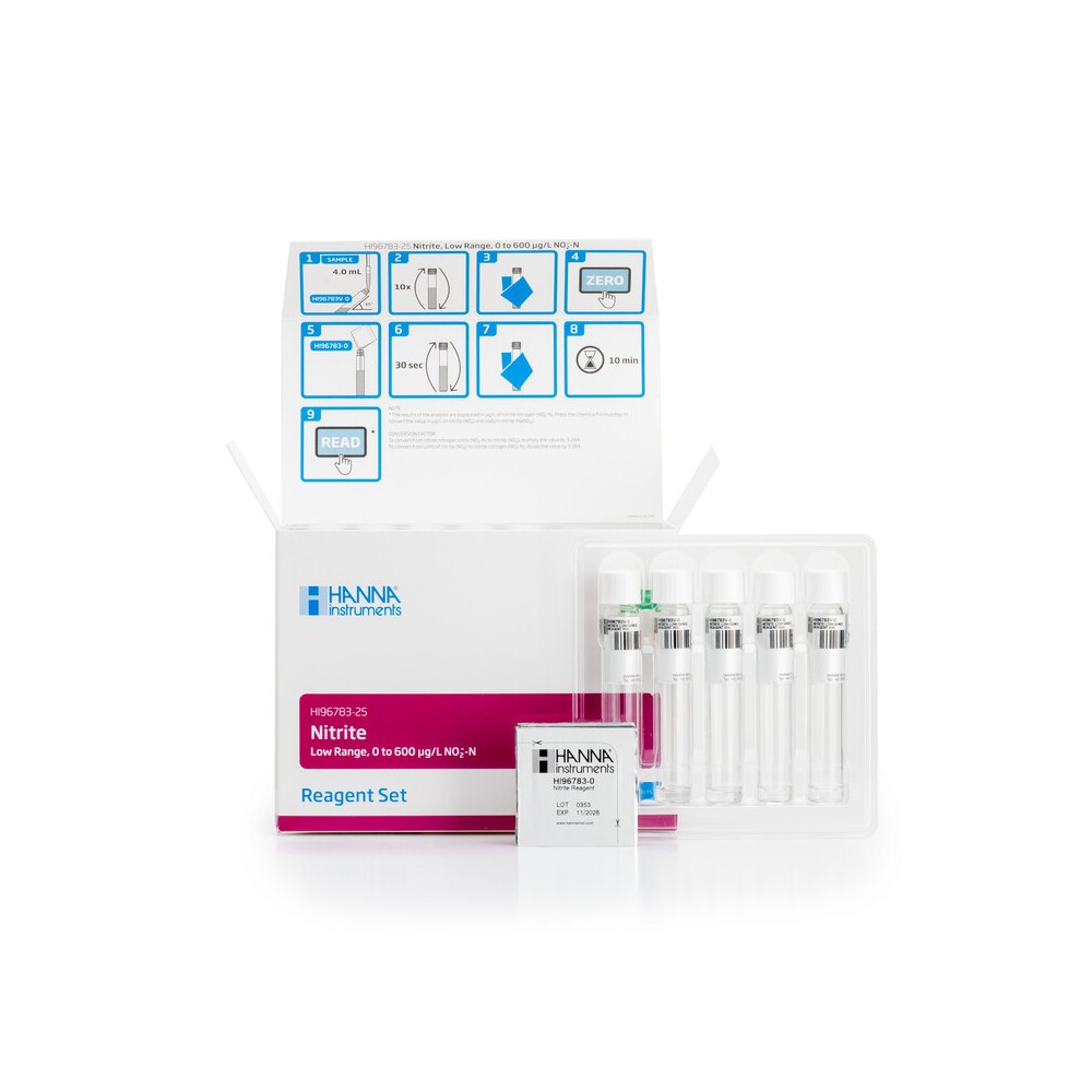 Los HI96783-25 (rango bajo) y HI96784-25 (rango medio) son reactivos pre-dosificados, que permite a los usuarios lograr mediciones colorimétricas rápidas y precisas. Estos reactivos utilizan una adaptación de los Métodos Estándar para el Análisis de Agua Potable y Aguas Residuales, 23ª Edición, Método de Diazotación 4500B, Nitrógeno Nitrito.